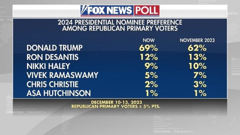 Ron DeSantis receives 12% support (down 1 point since November), Nikki Haley gets 9% (-1), Vivek Ramaswamy 5% (-2), Chris Christie 2% (-1), and Asa Hutchinson 1% (steady).
