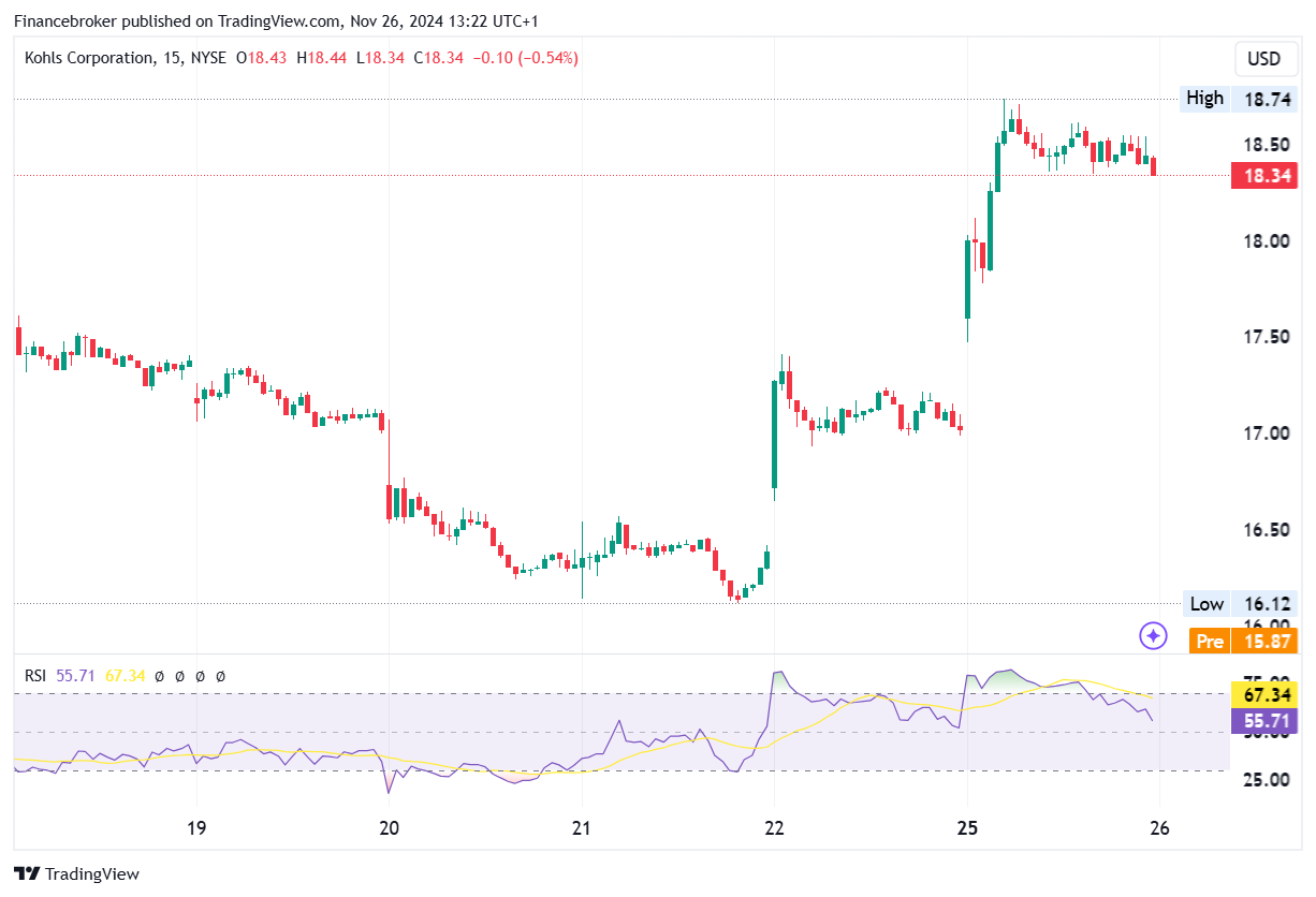 The 15-minute chart of Kohl’s Corporation (NYSE: KSS) demonstrates significant price action and momentum shifts over recent sessions. After a prolonged downtrend, the stock bottomed near $16.12 on the 20th before experiencing a sharp bullish reversal. A strong green candlestick on the 22nd signals robust buying interest, pushing the price above $18.