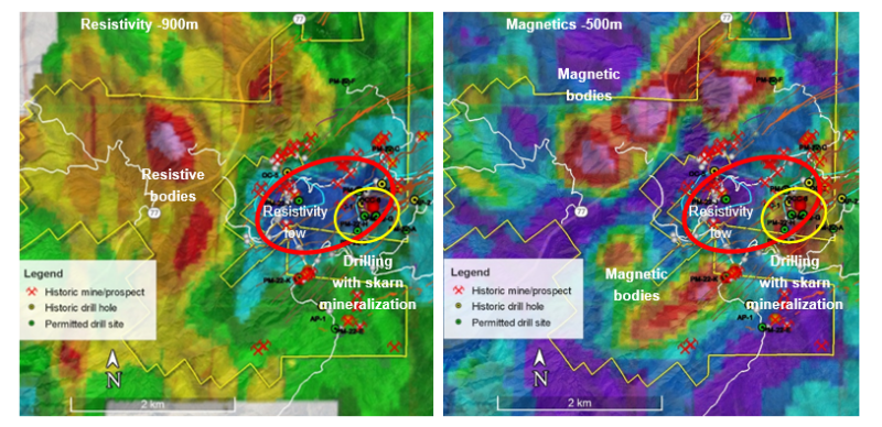 Support for the Company’s mineralization model at the project comes from several sources, including the results of historical drilling and ground geophysical surveys, distribution of dikes with xenoliths of Cu-bearing skarn, the interpretation of the 2023 ZTEM survey as well as the results of an AI study carried out by Exploration Technologies. The postulated sulfide mineralization measures 1,100 meters by 1,150 meters.