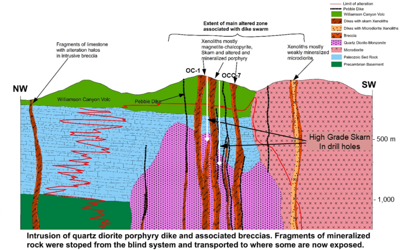 Historical drill holes cut high grade skarn mineralization including 23 meters with 0.54% Cu at 640 meters depth (hole OC-1), 18 m with 1.4% Cu and 4.65% Zn at 830 meters depth (hole OCC-7), and 7.6 m with 1.73% Cu and 0.11% Zn at 703 meters and 4.6 meters with 1.4% Cu and 0.88% Zn at 716 meters (OCC-8). Mineralization occurs within a several hundred-meter-thick altered zone hosted in favorable Paleozoic carbonate rocks that underly a sequence of Cretaceous andesitic volcanic rocks. These carbonates are the same rocks that host the high-grade copper mineralization at Freeport’s nearly Christmas mine. The historic drilling intersected a blind mineralized intrusion associated with the skarn mineralization, providing an immediate drill target that is believed to be the source of the mineralization at Hot Breccia (Figure 3). Several magnetic highs in the region surrounding the proposed intrusion may also indicated buried skarn mineralization and provide additional exploration targets.