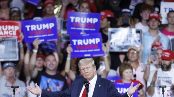 CHARLOTTE — In his first mention of the likely Democratic presidential nominee, Donald Trump told a Wednesday night crowd here that “KAH-mala” Harris was...
